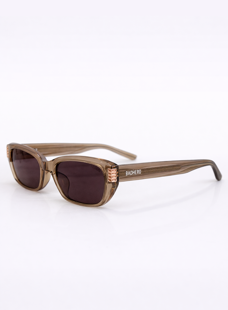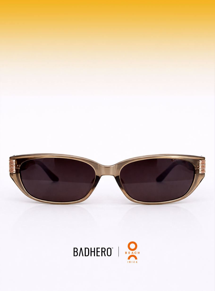Make a statement with our Fiesta, part of the limited O Beach x BadHero collection. Featuring a bold silhouette and warm brown and beige tones, these sunglasses blend a subtle cat-eye shape with thick retro-inspired acetate for a confident, fashion-forward look. Designed to turn heads while staying effortlessly wearable, they bring elevated style to any outfit. a small rose gold accent to bring that luxury vibe!